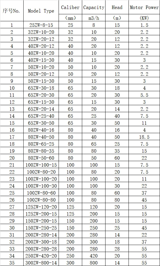 ZW self-priming non-clogging sewage pump is a product with novel structure successfully developed on the basis of repeated research on the technology of similar products at home and abroad. And through the unique design of the pump body and the impeller flow channel, it is not necessary to install a bottom valve and irrigation water like a general self-priming clean water pump, and it can also suck and discharge impurities containing large particles and long fibers. It is widely used in municipal sewage projects, river pond aquaculture manure treatment, sedimentation of waste ore impurities, impurity pump for light industry, papermaking, food, chemical,pharmaceutical, electric power, paddle materials and mixtures and other chemical media.